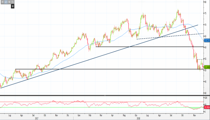 Le quotazioni sono giunte al re-test dell’importante quota dei 50 dollari. Questa zona è avvalorata da tre elementi: il primo dato dal livello statico lasciato in eredità dai massimi del 31 luglio 2017, il secondo dovuto alla valenza psicologica di questa cifra tonda, il terzo fornito dalla corrispondenza di tale area al 50% del ritracciamento di Fibonacci disegnato con i minimi dell’11 febbraio 2016 ai massimi del 3 ottobre 2018.
