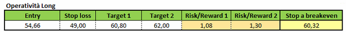 In questo caso, il punto di entrata si troverebbe a 54,66 dollari mentre lo stop loss a 49 dollari al barile. L’obiettivo principale dell’operazione sarebbe individuabile a 60,80 dollari al barile e l’obiettivo finale a 62 dollari.