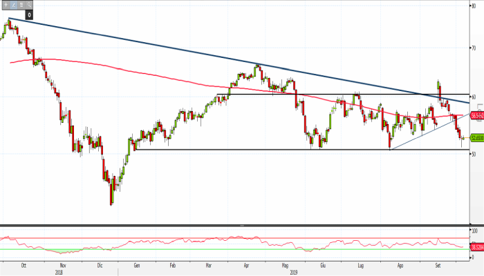 La discesa in essere ha permesso ai venditori di rompere un’area supportiva importante, quella dei 56,80 dollari, dove transitano sia la media mobile semplice a 200 giorni che la linea di tendenza che collega i minimi del 7 agosto a quelli del 3 settembre 2019.