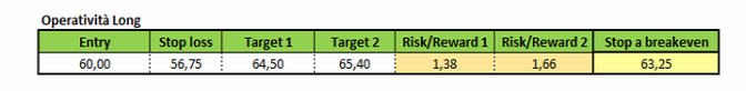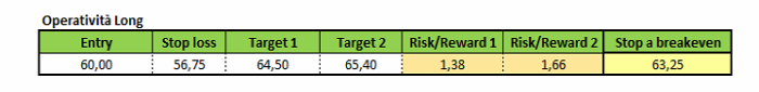 A questo proposito, lo stop loss andrebbe posto a 56,75 dollari, l’obiettivo principale a 64,50 dollari e l’obiettivo finale a 65,40 dollari.