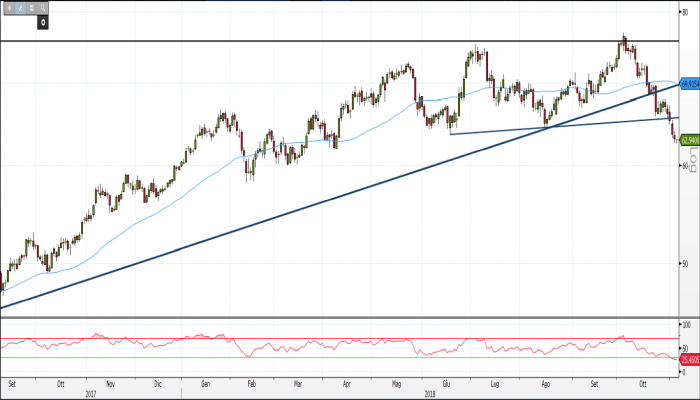 Ancora una seduta all’insegna delle vendite sul petrolio WTI, che dallo scorso 4 ottobre ha perso oltre il 18% del suo valore dai massimi a 76,90 dollari, attestandosi attualmente a 62,84 dollari al barile.