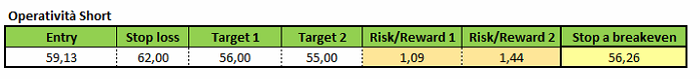 Da un punto di vista operativo, l’ipotesi di rialzi potrebbero essere sfruttati per implementare una strategia di matrice short da 59,13 dollari al barile. Lo stop loss andrebbe posto al di sopra di 62 dollari, mentre l’obiettivo principale a 56 dollari. Il target più ambizioso sarebbe invece identificabile a 55 dollari.