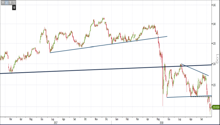 Tale rimbalzo si troverebbe a fare i conti con l’importante ostacolo posto a 122,50 euro, dove transita la resistenza fornita dalla linea di tendenza che collega i minimi dell’8 giugno a quelli del 15 agosto 2018. Le quotazioni potrebbero quindi avere un leggero apprezzamento prima di proseguire con il forte downtrend in cui sono inserite.