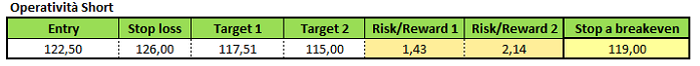 Si potrebbe pertanto attendere un raggiungimento di quota 122,50 euro per adottare strategie di matrice ribassista. Tale tipo di operatività avrebbe stop loss da porsi sopra 126 euro, obiettivo principale a 117,51 euro e obiettivo finale a 115 euro.