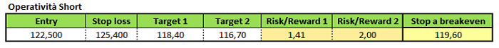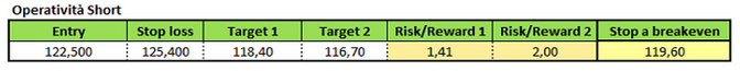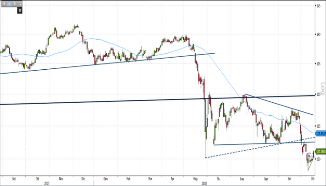 Lo stop loss in questo caso andrebbe posto a 125,40 euro, mentre l’obiettivo principale a 118,40 euro. L’obiettivo finale sarebbe invece individuabile in area 116,70 euro.