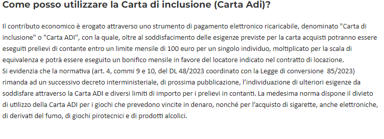 Nella parte in cui si parlava degli acquisti consentiti con la carta Adi ci si limitava a indicare beni alimentari, nonché gli acquisti in farmacia e parafarmacia (eccetto quelli voluttuari).
