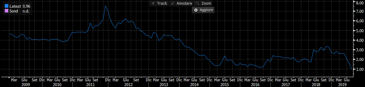 L’asta odierna del decennale italiano ha visto crollare i rendimenti allo 0,96%, livelli più bassi di sempre, come evidenziato dal grafico della piattaforma Bloomberg.