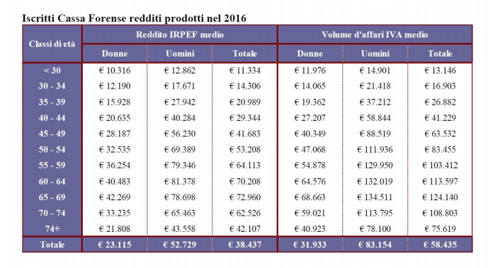 A far riflettere però è la differenza di reddito che c’è tra gli avvocati uomini e le donne: i primi infatti hanno un reddito Irpef medio pari a 52.729€ e un volume d’affari IVA medio di 83.154€, mentre per le donne entrambi sono molto più bassi, rispettivamente pari a 23.115€ e 31.933€. Un avvocato donna, quindi, guadagna circa il 40% di un avvocato uomo.