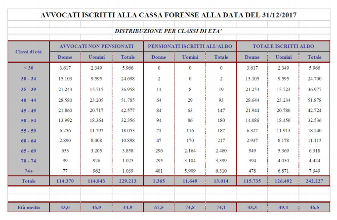 Tra il 2007 e il 2017 l’età media degli avvocati è aumentata di 3 anni: infatti, mentre allora l’età media di un legale era di 42 anni, oggi si è arrivati a 45 anni.