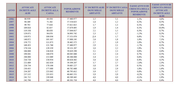 Al 1° gennaio 2018 sono 242mila gli avvocati regolarmente residenti in Italia. Ci sono quindi circa 4 avvocati ogni 1.000 abitanti.
