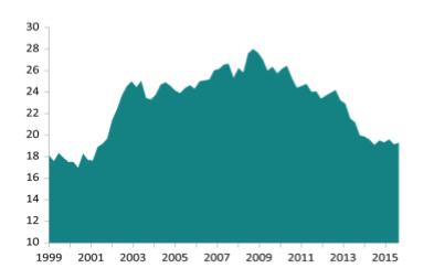 (Percentuale di Euro presente nelle riserve valutarie mondiali)