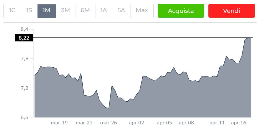 L’andamento del titolo nell’ultimo mese: all’estrema destra del grafico l’odierno rally