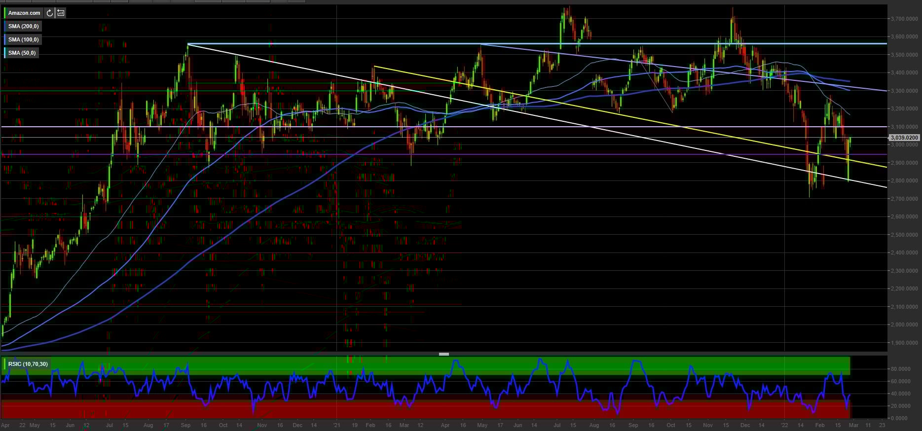 Nel giro di un mese le azioni del colosso fondato da Jeff Bezos sono andate per ben due volte a testare il supporto fornito dalla trendline ottenuta dai minimi del 1° settembre e del 12 ottobre 2020: