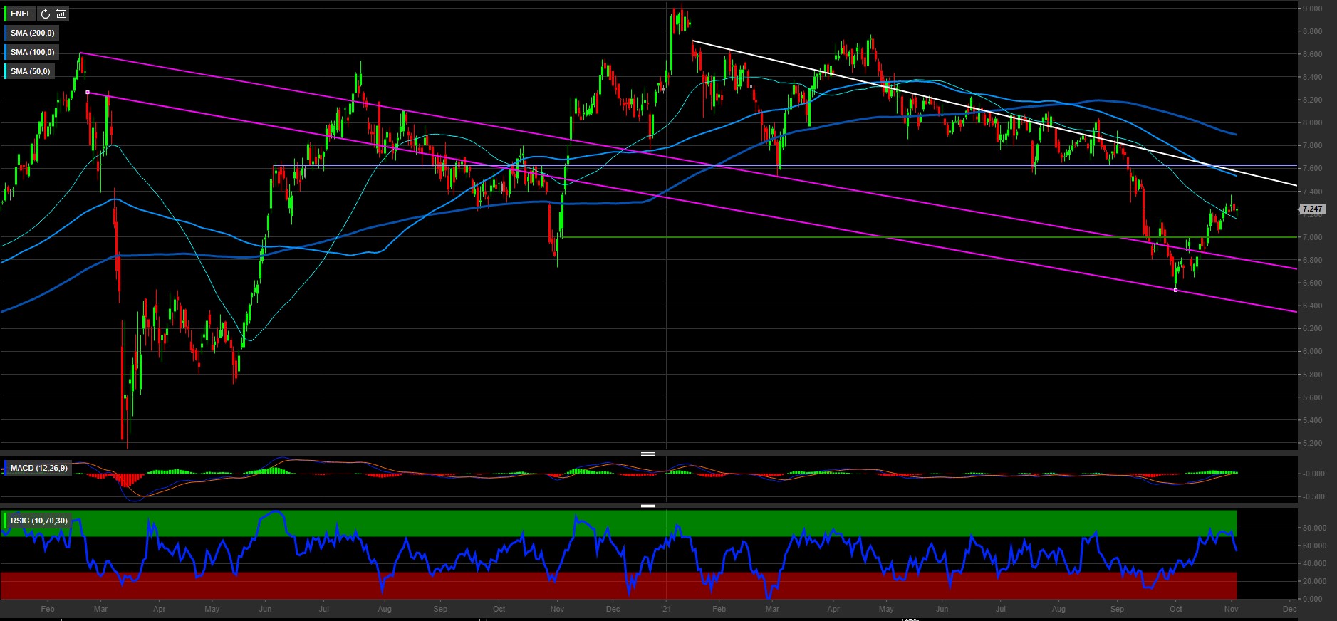 Dopo la decisa correzione partita a inizio settembre, le azioni Enel hanno recuperato terreno portandosi agli attuali 7,25 euro.