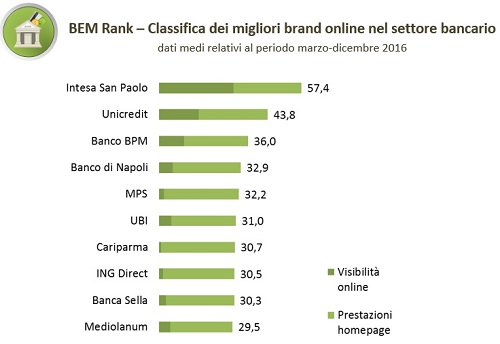 La classifica delle banche italiane con le migliori performance online è stata stilata tramite il Bem Rank, ossia un indice che misura le performance web delle aziende che posseggono un sito in lingua italiana. L’indice citato permette dunque di evidenziare e stilare una classifica dei migliori brand online.