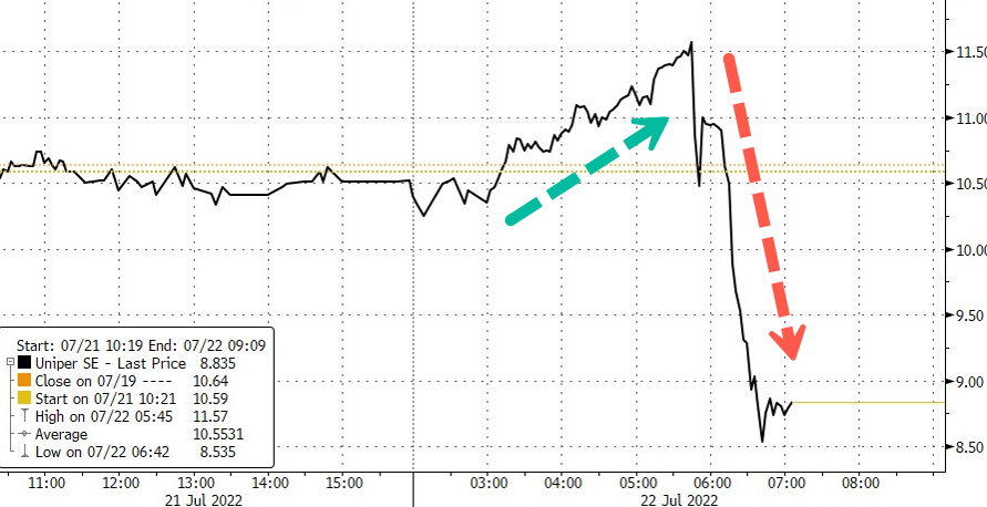 il primo dei quali cristallizza la reazione di mercato alla notizia. Se le prime indiscrezioni sull’accordo rilanciate da Bloomberg avevano infatti fatto salire il titolo di Uniper del 7%, una volta letti i dettagli il mercato ha bocciato l’intesa e spedito l’azione a -16% a un minimo di 6,95, salvo chiudere a 7.46 dai 10,33 dell’apertura. Comunque sia, se non una bocciatura totale, almeno tre materie da riparare a settembre. E il motivo è insito nella seconda immagine: con Nord Stream che opera al 40% della capacity e gli stoccaggi tedeschi al 65% del totale rispetto al 90% necessario entro il 1 novembre, il mercato prezza già oggi il worst case scenario.