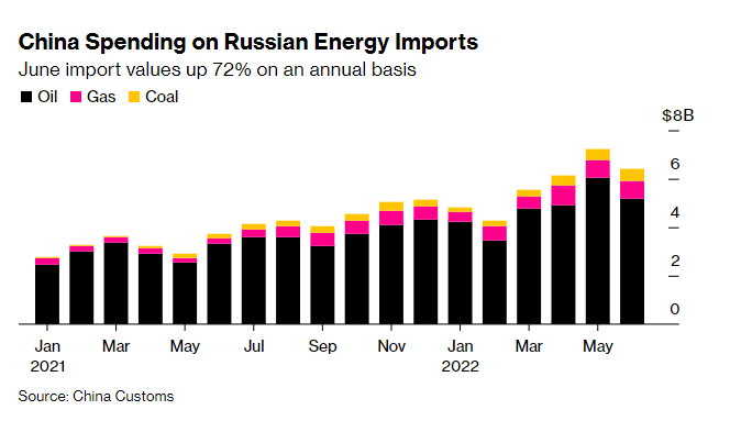 Controvalori di spesa su base annua dell’import energetico cinese dalla Russia