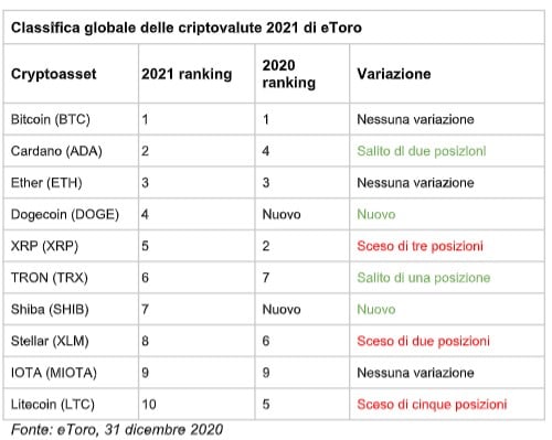 E’ quanto emerge dalla classifica 2021 delle posizioni in criptovalute detenute sulla piattaforma di eToro.