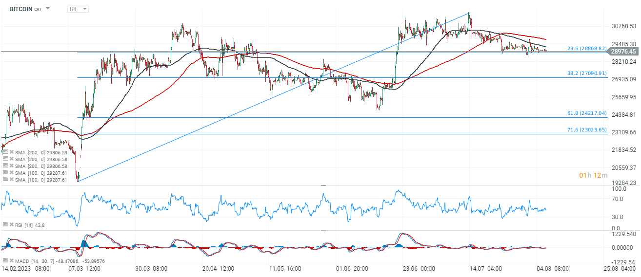 Il grafico BITCOIN H4 indica che la criptovaluta sta lottando per rimanere al di sopra del 23,6% del ritracciamento di Fibonacci dell’ondata rialzista del 10 aprile 2023 al livello di 28.900. Un calo al di sotto potrebbe preannunciare un nuovo test di $27.000 (38,2 Fibo). L’RSI a 43 punti è ancora relativamente vicino alla zona neutra.