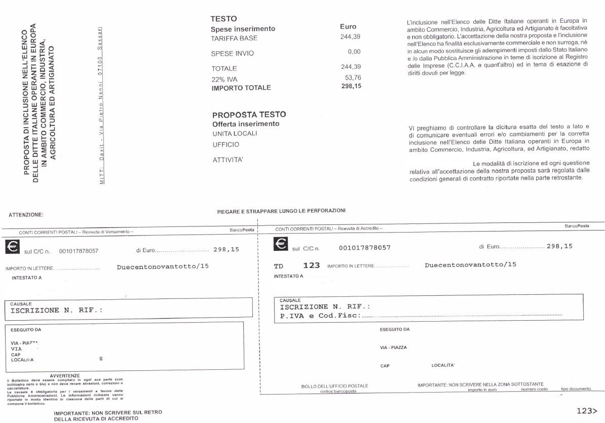 Ormai da diversi anni le ditte individuali e le società neo costituite ricevono, pochi mesi dopo la costituzione, un bollettino postale riportante la seguente dicitura “proposta di inclusione nell’elenco delle ditte italiane operanti in Europa in ambito commercio, industria, agricoltura ed artigianato”.