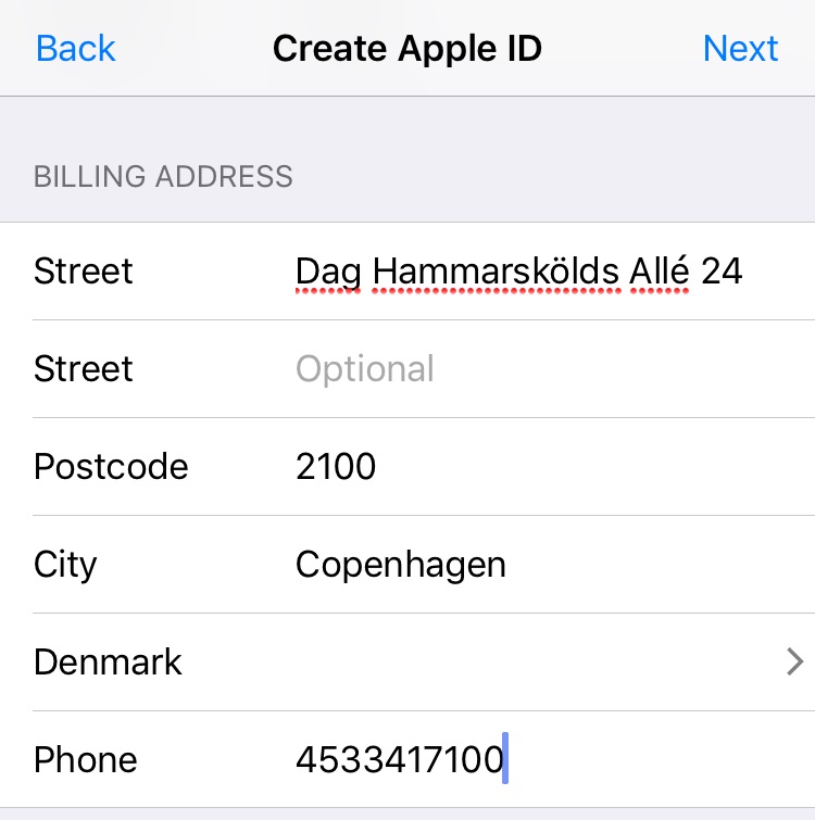 3 - È necessario specificare un indirizzo danese che può essere qualsiasi indirizzo valido (preso a caso da google maps). Puoi utilizzare questo indirizzo: