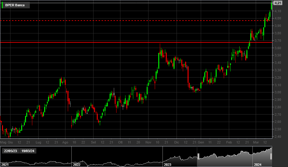 Con il rialzo di questa settimana, BPER Banca si lascia alle spalle un importante area di resistenza a 4 euro circa definita dal 61,8% di ritracciamento del ribasso partito nel 2014. Di norma, la rottura di questa percentuale ricavata dalla successione di Fibonacci prelude al ritorno nel punto di origine del movimento: in questo caso il rally potrebbe dunque estendersi verso target a 5 euro e piano in alto fino a 6 euro circa, top del 2014. Nella direzione opposta, discese sotto 3,96 euro potrebbero dare il via a prese di beneficio, anticipando il test dei supporti a 3,86 e 3,68 euro.