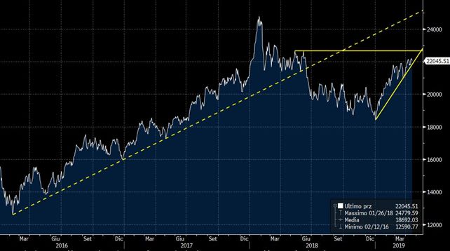 Analisi tecnica. In questa prima parte di anno l’indice ha guadagnato il 16,2% circa, riproponendosi oltre i 22mila punti, ossia sui massimi di giugno 2018. La conferma del breakout di questo livello è molto importante per l’indice perché può determinare l’accelerazione della tendenza rialzista vista in questo primo quadrimestre verso i massimi storici dell’indice, ad oggi posti sopra i 24mila punti. Al tempo stesso va evidenziato come il movimento rialzista intrapreso dai minimi del dicembre 2018 sia stato sostenuto da una trendline particolarmente inclinata e la presenza delle resistenze statiche espresse in prossimità dei 23 mila punti potrebbe favorire qualche presa di beneficio prima di una nuova ripartenza al rialzo.