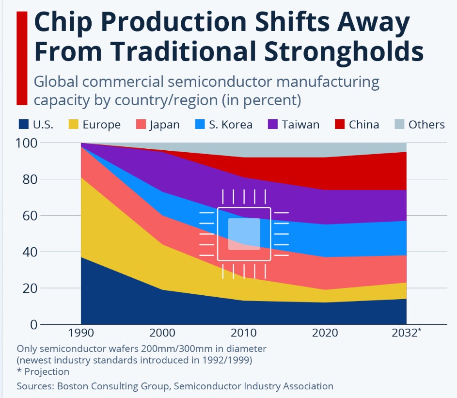 Uno sguardo all’evoluzione della produzione di chip nel mondo, dal 1990 a proiezioni fino al 2032, mostra come l’Occidente abbia perso il prestigio di un tempo, soppiantato dalla corsa nel settore di Paesi asiatici (Cina e non solo).