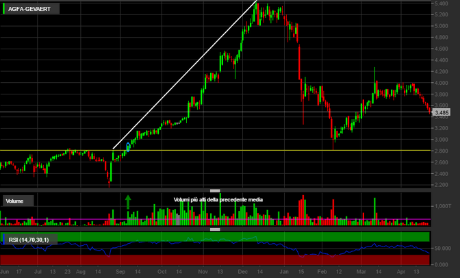 Infatti, qualche giorno dopo il titolo torna a testare la resistenza, rompendola, con volumi sempre molto alti. Per tutta la fase di salita il titolo registra volumi alti: questo vuol dire che i grossi investitori si sono accorti delle potenzialità dell’azienda e hanno cominciato a fare incetta delle azioni. Se avessimo comprato a €2,8 e avessimo rivenduto a €5, beh fate voi il calcolo del guadagno.