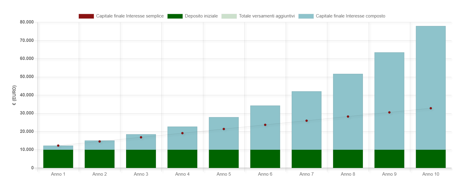 Calcolo capitale finale interesse composto 10.000€ in 10 anni al 22,8%
