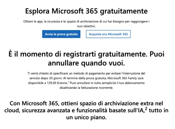 Il primo metodo che vogliamo proporti è la prova gratuita del pacchetto Microsoft 365 e Office. Forse non ne eri a conoscenza, ma ancora oggi c’è la possibilità di attivare un periodo di 30 giorni senza alcun costo aggiuntivo. Una soluzione pensata per permettere agli utenti di testare le potenzialità dei vari software, così da convincerli a proseguire poi con il piano a pagamento.