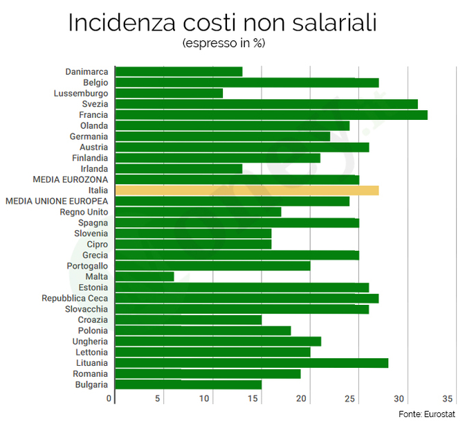 Infatti, da noi i costi non salariali - ovvero i contributi sociali a carico dei datori di lavoro - incidono per il 27,5% sul costo complessivo del lavoro, il quarto valore più alto tra quelli dei Paesi dell’Unione Europea (dopo Francia, Svezia e Lituania). In Italia, quindi, sono le tasse sul lavoro ad impedire alle aziende di essere competitive come dovrebbero.