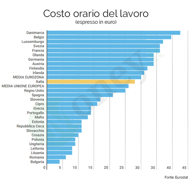 In fondo alla classifica - inarrivabili per l’Italia e per la maggior parte dei Paesi dell’Unione Europea - troviamo Lituania, Romania e Bulgaria dove il costo del lavoro orario è molto basso, rispettivamente pari a 8€, 6,30€ e 4,90€.