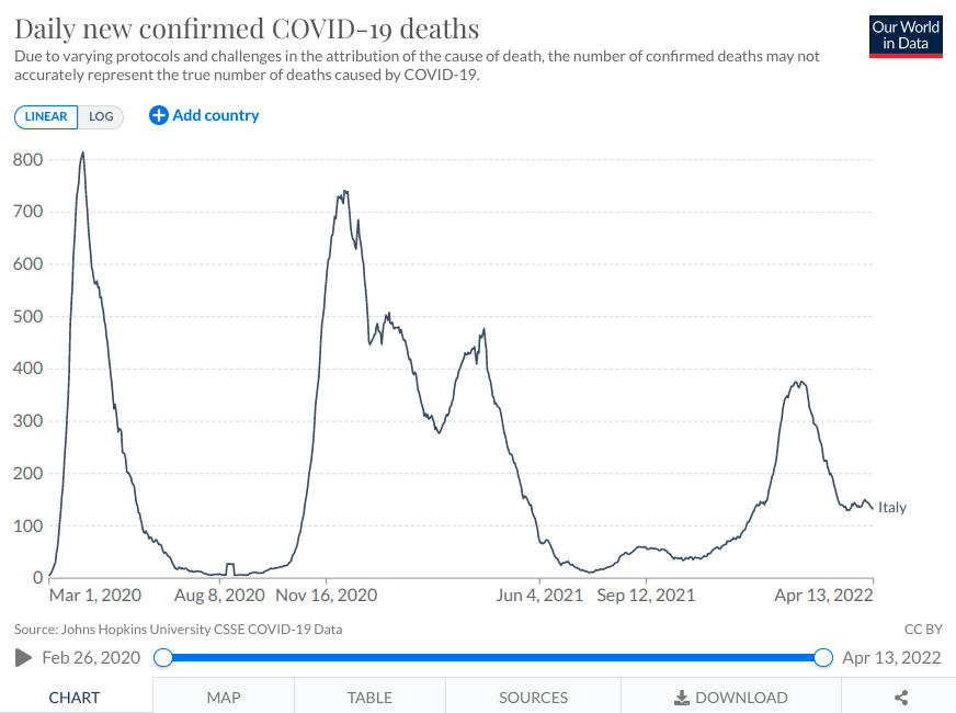 La quarta ondata, durante la quale abbiamo raggiunto il picco massimo di contagi, è quella che ha registrato meno vittime (il picco di decessi è a gennaio 2022 con circa 370 morti nelle 24 ore). La ragioni sono due: l’imponente campagna vaccinale (circa il 90% della popolazione over 12 ha completato il ciclo vaccinale primario) e la minore letalità della variante Omicron.