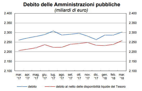 Dal report, come accennato, è emerso un nuovo aumento del debito pubblico italiano che dai 2.286 miliardi di euro di febbraio è salito su quota 2.302 miliardi di euro. Nonostante l’aumento, il dato è riuscito comunque a mantenersi al di sotto dei massimi registrati a luglio 2017, quando l’indebitamento delle pubbliche amministrazioni è schizzato su quota 2.308 miliardi.