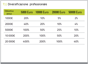 Supponiamo che abbiate stabilito un obbiettivo annuo di 12.000 euro. Questo importo deve essere guadagnato con una resa del 27 percento. Nel calcolo puro, il nostro capitale iniziale dovrà aggirarsi intorno ai 44.500 euro. Maggiore sarà la vostra valutazione del reddito realisticamente realizzabile al mese e all’anno, minore sarà il capitale iniziale necessario (vedi tabella 1).