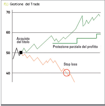 La prima è una lezione su come affrontare il rischio; la seconda è una lezione su come utilizzare il capitale. Se saprete gestire questi due punti, avrete meno lezioni da imparare in futuro. Ma ora ritorniamo al nostro esempio: ora sappiamo cosa accade quando non si verifica la nostra aspettativa iniziale che il titolo salga. Allora, limitiamo il nostro rischio ai valori impostati dal padrone. Iniziamo dal caso del profilo. Il titolo effettivamente sale, per esempio a 60 euro. Il padrone ha detto che non più del 50 percento del profitto può essere ritornato. Il 50 percento dei nostri profitti (dieci euro) sono cinque. Se questi sono dedotti da 60, arrivano a 55. Se il titolo ha superato la soglia 60, non può essere venduto sotto a 55. Se arriva a 70 euro, 60 sarà il limite minimo, e così via.