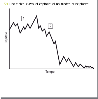 Presentiamo una curva di capitale di un trader principiante. All’inizio è speculativo (punto 1). Dopo un po’, si verificano una serie di perdite (punto 2). Il trader “rivuole i suoi soldi” e aumenta il rischio, così anche la dimensione delle posizioni nei suoi trade. Ora, un paio di perdite possono decimare rapidamente il capitale, come spesso accade nel mondo reale: è solo una questione di tempo |