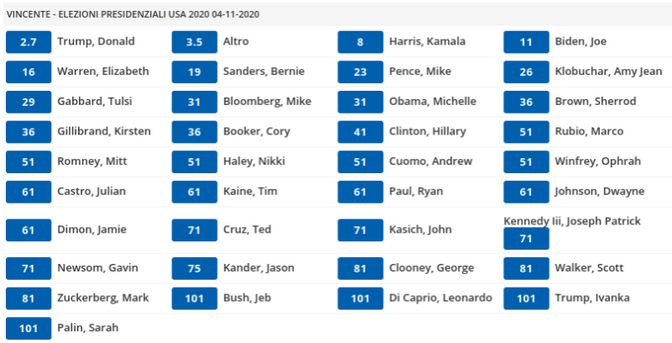 Come si può vedere, nell’elenco sono presenti sia esponenti Repubblicani che Democratici. I principali competitor interni dell’attuale Presidente sono quindi il suo Vice Mike Pence e il senatore della Florida Marco Rubio.