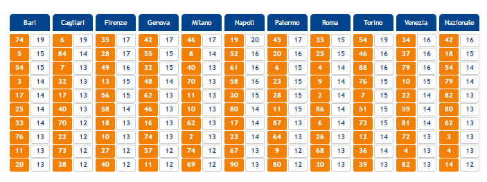 Ecco invece una tabella presa dal sito della Lottomatica in cui vengono elencati i numeri che escono frequentemente sulle varie ruote e quindi possono essere considerati fortunati.