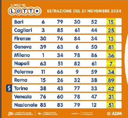 Per il Lotto, sono stati estratti i numeri su tutte le dieci ruote, inclusa la Nazionale. Segnaliamo anche la recente introduzione del Numero Oro, un’opzione lanciata a giugno 2024 che permette ai giocatori di scommettere sul quinto numero estratto su ogni ruota, aggiungendo così un nuovo livello di eccitazione alla serata. Ecco i numeri vincenti appena rivelati.