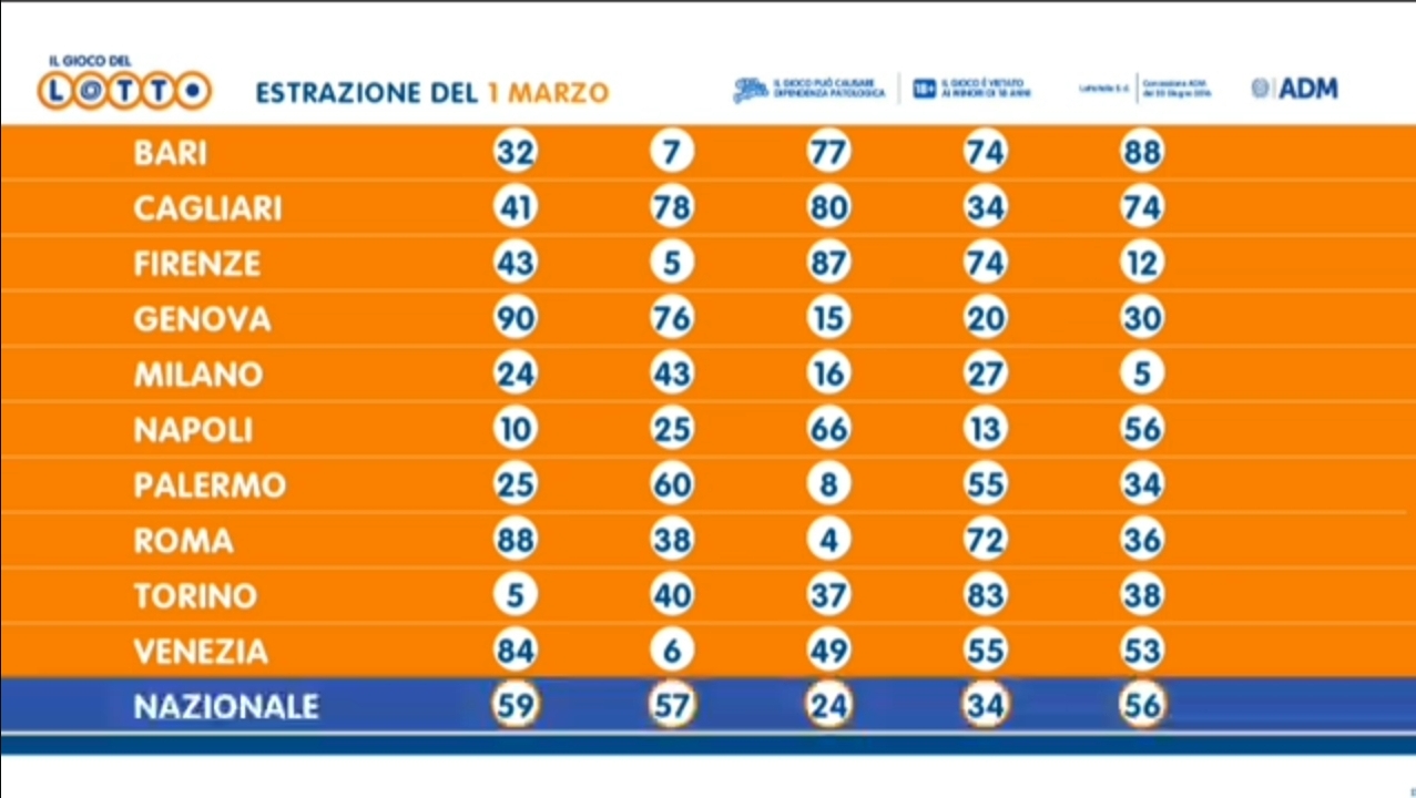 - Nazionale: 59 - 57 - 24 - 34 - 56