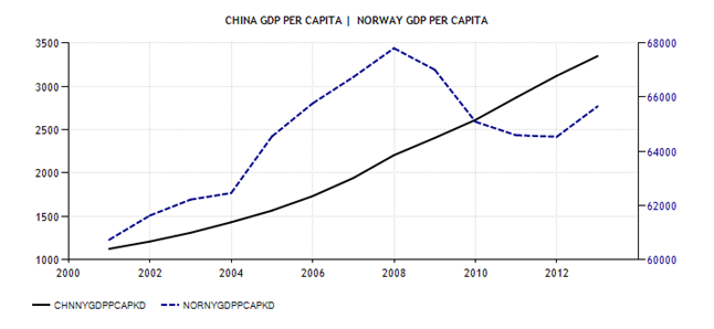 La prima cosa che verifichiamo è il reddito pro capite di Cina e Norvegia. Le fonti, sulla quantità delle cifre, sono, in un certo senso, discordanti; ma in ogni caso confermano una differenza abissale. Infatti il PIL pro capite riportato dal Global Competitiveness Report del 2011 parla di un reddito pro capite in Norvegia di oltre 84 mila dollari, mentre in Cina siamo oltre i 4 mila (a valori correnti). Il World Development Indicators – i cui dati si possono trovare anche tramite Google Public Data – riporta un reddito procapite per la Norvegia di oltre 65 mila dollari e per la Cina di circa 3.300 (a valori costanti con il 2000 come anno di riferimento). Questi ultimi dati sono confermati nel grafico sotto riportato – dal sito Trading Economics che fornisce dati su indicatori economici e che, viste le differenti definizioni a volte utilizzate, è meglio incrociare con altre fonti come appena fatto - dove è vero che si nota una diminuzione del PIL pro capite in Norvegia (linea blu, scala di destra) tra il 2008 ed il 2012, rispetto alla costante crescita di quello cinese (linea nera scala di sinistra), ma questo non può inficiare il fatto che tra il PIL procapite norvegese e cinese ci sia una differenza abissale.