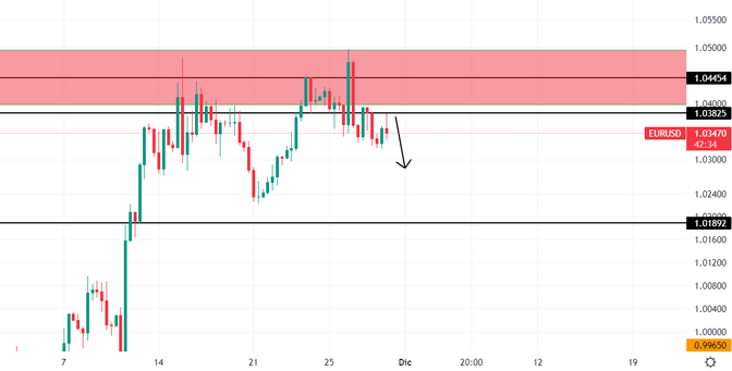 In questo contesto si dà più rilevanza a un time frame più breve in quanto sui time frame lunghi abbiamo già visto e individuato un’area rilevante che poi è stata per certi versi confermata come area di resistenza su base daily. A questo punto non ci rimane altro che individuare i time frame più brevi di questi e vedere dove il mercato reagisce ed effettivamente 1,0380 sembra essere un livello rilevante. In tal merito potremmo ipotizzare un target di movimento di breve verso 1,03 con la possibilità di vedere allunghi fino a 1,0280. Questo è uno scenario plausibile qualora dovesse partire un movimento ribassista già nella giornata di oggi.