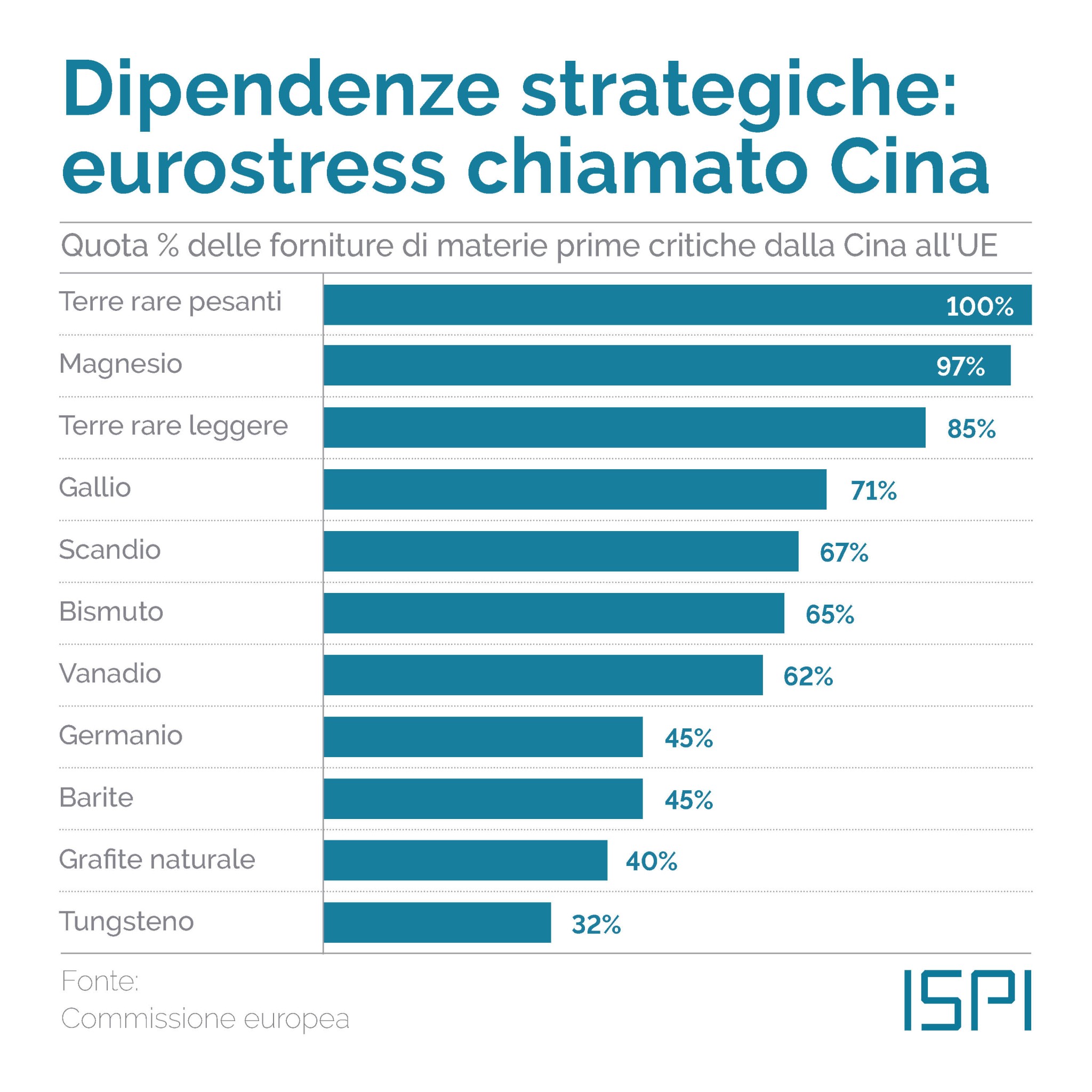 La partita, in realtà, si gioca su più fronti. Le ritorsioni cinesi sono un allarme per l’Europa, così come è impensabile sostituire il dragone su alcune materie prime: il grafico Ispi è eloquente.