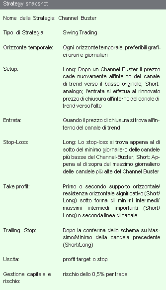 Tuttavia, non si possono derivare target di prezzo espliciti. Di conseguenza, il Channel Buster si può attribuire al classico swing-trading. Il setup richiede due cose essenziali: