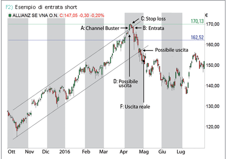 Punto B: Il quarto giorno del breakout, i prezzi ricadono sul canale di trend originario. Ne segue un’entrata short il 15/04/2015 a 168,15 euro.