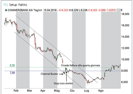 L’esempio della Commerzbank AG nel maggio 2013 (figura 3) mostra che quattro giorni dopo il segnale di entrata, il trade fallisce e il trend verso il basso viene ripristinato. Una stop-loss (linea verde) nel rispetto della strategia discussa in precedenza ha perfino portato ad un piccolo profitto, e impedito perdite.