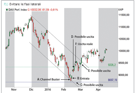 Punto F: Con questa strategia di stop-loss si uscirebbe il 19/02/2016 a 9388.05. Nell’arco di cinque giornate di trading si sarebbe ottenuto un profitto di 420.54 punti equivalenti al 4,7%. Anche al breakout del canale di trend e alla potenziale inversione del trend, mantenere questo sistema sarebbe giustificato per mettere al sicuro i guadagni esistenti.