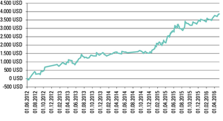 Il back test è stato creato dal 06/01/2012 fino al 31/05/2016, mostrando una performance generale di $3.861 prima dei costi ogni qual volta abbiamo fatto trading con un mini lotto su EUR/USD. La figura 3 illustra il corso della curva prestazionale, e la tabella 1 mostra il rapporto prestazionale dettagliato della strategia.